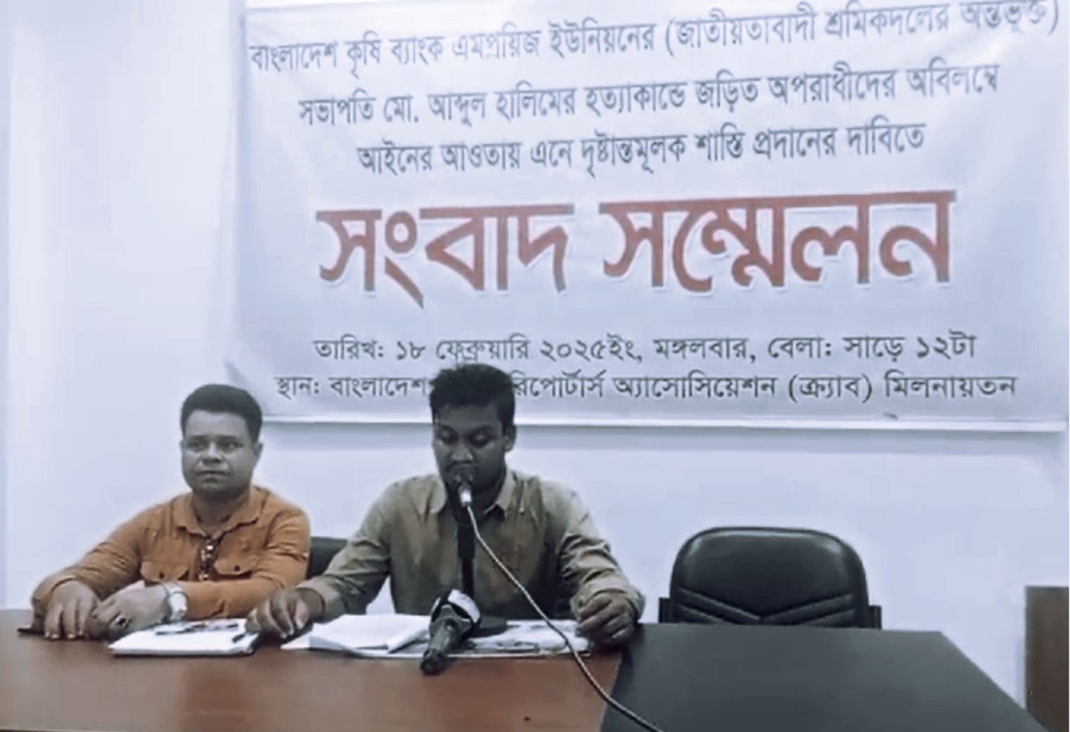 বাংলাদেশ কৃষি ব্যাংক এমপ্লয়িজ ইউনিয়নের (জাতীয়তাবাদী শ্রমিক দলের অন্তর্ভুক্ত) সভাপতি মো. আব্দুল হালিমের হত্যাকান্ডে জড়িতদের অবিলম্বে গ্রেপ্তার ও দৃষ্টান্তমূলক শাস্তির দাবি জানিয়েছেন নিহতের ছেলে এ জেড এম ফয়সাল খান। হত্যাকারীরা বর্তমানে কৃষি ব্যাংকে বহাল তবিয়তে চাকুরি করে যাচ্ছে। এক্ষেত্রে প্রধান উপদেষ্টা, স্বরাষ্ট্র উপদেষ্টা, আইজিপিসহ সংশ্লিষ্টদের জরুরী হস্তক্ষেপের দাবি জানান।