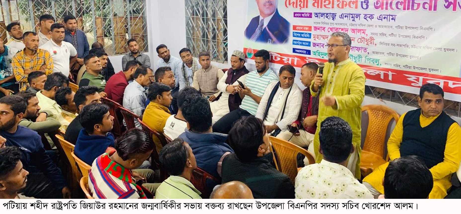 বিএনপির প্রতিষ্ঠাতা ও প্রয়াত শহীদ রাষ্ট্রপতি জিয়াউর রহমানের ৮৯তম জন্মবার্ষিকী উপলক্ষে পটিয়া উপজেলা যুবদলের উদ্যোগে আলোচনা সভা ও দোয়া মাহফিল অনুষ্ঠিত হয়েছে। সোমবার (২০ জানুয়ারি) সংগঠনের দলীয় কার্যালয়ে এ দোয়া মাহফিল ও সভা অনুষ্ঠিত হয়। উপজেলা যুবদলের আহ্বায়ক ইয়াসিন আরাফাতের সভাপতিত্বে ও সদস্য সচিব অহিদুল আলম চৌধুরী পিবলু’র সঞ্চালনায় এতে প্রধান অতিথি ছিলেন পটিয়া উপজেলা বিএনপির সদস্য সচিব খোরশেদ আলম। প্রধান বক্তা ছিলেন দক্ষিণ জেলা যুবদলের সিনিয়র সহ সভাপতি শাহজাহান চৌধুরী, দোয়া মাহফিল পরিচালনা করেন পৌরসভা ওলামা দলের আহ্বায়ক মাওলানা কাজী মুরাদ, বিশেষ অতিথি ছিলেন উপজেলা যুবদলের যুগ্ন আহ্বায়ক ইসমাইল হোসেন, আবদুল করিম মেম্বার, কাজী আরিফ, শহিদুল আনোয়ার লিটন, গাজী দুলাল, মুহাম্মদ সোলায়মান, শহীদুল ইসলাম, আরিফুর রহমান তারেক, জিয়াউর রহমান জিয়া, ইঞ্জিনিয়ার মুহাম্মদ নাছির হাজারী প্রমুখ।