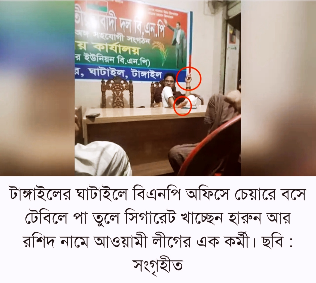 টাঙ্গাইলের ঘাটাইলে বিএনপি অফিসে চেয়ারে বসে টেবিলে পা তুলে সিগারেট খাচ্ছেন হারুন আর রশিদ নামে আওয়ামী লীগের এক কর্মী। রোববার (২৫ মে) রাতে সামাজিক যোগাযোগমাধ্যম ফেসবুকে এ ছবি ভাইরাল হয়। ওই আ.লীগ কর্মী রাত-দিন অফিসে আড্ডা দেন।