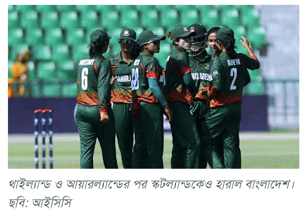 লাহোরের গাদ্দাফি স্টেডিয়ামে মঙ্গলবার স্কটল্যান্ডকে ৩৪ রানে হারায় বাংলাদেশ। নিগার সুলতানার বিধ্বংসী ৮৩ রানের সঙ্গে ফারজানা হক ও শারমিন আক্তারের ফিফটিতে ২৭৬ রান করে তারা। জবাবে ২৪২ রানের বেশি করতে পারেনি স্কটিশরা।